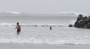 このポイントの左は湾になっているんだけど、その湾の真ん中にサーファー2人が浮いていた。割れていない所に。あれって…流されてる!?浜からは数百mの場所だ。考えるだけで恐ろしい!