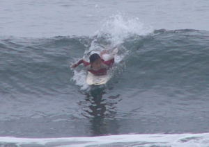 AM7:15 マー坊が観戦にやって来た。おいらのデジカメ撮影をマー坊に託した。この日記念すべき第1ヒートでいきなりコウキの登場だ。高津佐さんから「第1ヒートの人、海入って練習してていいよ」と。コウキは海へ入っていって、何本か波に乗っていた。そしてホーンがなった瞬間にセットが入ってきて、「おっ、いきなりいいセット入ってきたじゃん!コウキ乗れ~!」と。パドルを始めたコウキは…あれれ!?腹ばいのまま波に乗って浜に上がってきたぞ!?間髪入れずに第2ヒートのはずの石ちゃんが登場してきた。ムムム!?実はおいらとマー坊、それにミヤケちゃんはコウキのヒートが始まっている事に気付かず、ずーっとただ練習しているだけかと思っていたのだ!写真も撮らず終い…。結局、コウキは敗退(気付かなかった事とは関係ないけどね)。