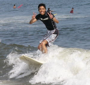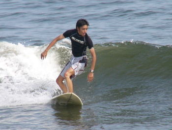 PM12:30 再度波チェックへ。オンショアが入り始め、ヒザ~モモ、たまーにセットで腰近い波が!天気は晴れ!こりゃ入水だ!ロングがベターだね。暑いのでタッパー無しのトランクスだ!