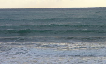 さて、波はというと、風はまだ弱くて面は落ち着いている。サイズは胸~肩、セットで頭。正面はライトもレフトも割れている。右のほうはレギュラーがいい感じで、人もいない。よっしゃ、ここでゲッティングアウト!さて、なかなかファーストライドが出ずに20分ほど経過。ようやくオイラがファーストライド!うねりはしっかりしているもののトロい波で、テイクオフして滑ってもまだうねり!?って感じだ。うねりに乗ってる感じ。なんか「超リトルサイズのジョーズ」っていうの?テイクオフしてうねりを滑る感じだ。で、ちょっとずつ波待ちポジションをインサイドにすると、たまにセットが入ってハードになる。インサイドはダンパーセッション。でも、ピークからつかんでロングライド出来て、乗れれば最高!