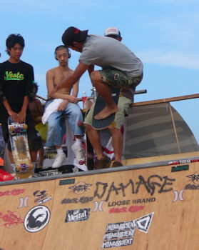 サーフィンの部が終わり、いよいよスケートの部の開始!テクニックの応酬だったり、サーフィンライクなマニューバを描いたりで、会場はストーク!大歓声とスケートを叩く音が鳴り止まない。