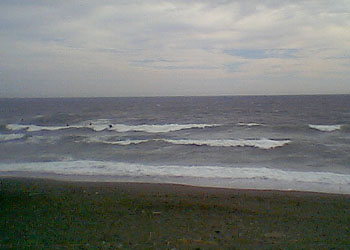 「船小屋」P右側がいいんでないの?と、既に石ちゃんが海で待っていた。オンショアが強烈だが、ウネリにはソコソコまとまりがあり、たまにセットでハラオーバーの波もあったりした。なんともファンなオンショアサーフ♪意外と楽しめましたわぁ。