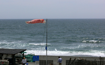 PM13:30 昨日に引き続きの猛烈なオンショアでサイズアップとなった昼下がり。天気もいいし、久々にみんな揃ってサーフィン出来そうなので、ルンルン気分でチャリンコを漕ぐ。恥ずかしながら2週間ぶりのサーフィン。「チサン」Pでショウと待ち合わせして、「白樺」Pまではるばる西へ進む。