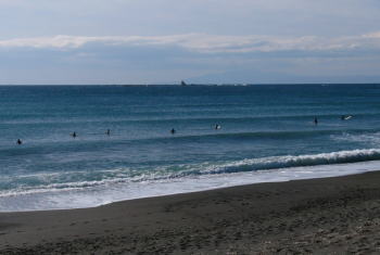 オンショアで砂がタップリとかぶさったサイクリングロードを進み、辻堂第2に到着。ちょうどショウ君が居て、よさ気なピークを見つけていざ入水!