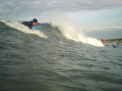 波チェックしてたら高津佐さんと隼矢がやって来て、チサン右側にパドルアウトしていって、早速高津佐さんはレトロクアッドをグイグイと走らせていた。ウラちゃんも戻ってきたので、ここで一緒に入水!
