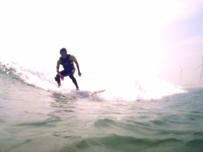 さて、ラインナップから見た風景は、横にピア&ビーチに巨大な風車と、なんとも日本離れした風景!そしてラインナップには僕たちだけ。