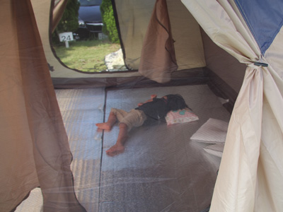 遊び疲れたリコもちょっと休憩…パパが自分のお小遣いで買ったというテントでね