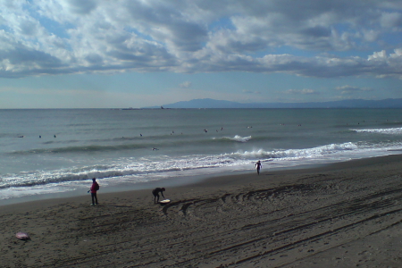 AM9:10 さぁ、起床!朝飯食べて早速海へ。北風ビュービュー、雲も多くてめっちゃ寒い。いつものポイントへ到着。ハラ~ムネくらいの波が。でも、オフショアが強くて面はザワザワ。波もかき消され気味で、割れにくそう。そのくせちょっと速いので、イマイチだ。